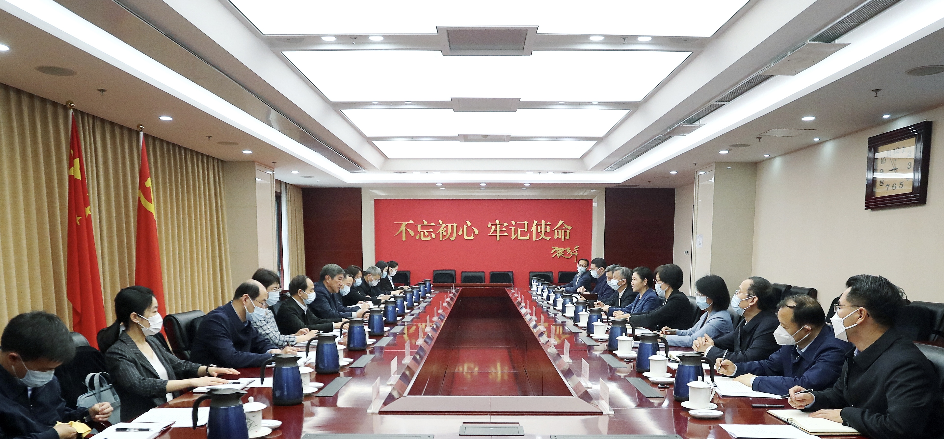 图为4月19日上午,司法部党组书记、部长贺荣与全国人大常委会委员、全国人大监察和司法委员会主任委员杨晓超一行座谈。 摄影 李光印