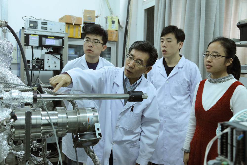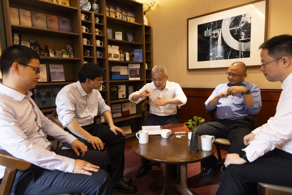 6月22日,在中国科学院物理研究所,方忠(中)和团队成员王志俊(左一)、翁红明(左二)、戴希(右二)、余睿(右一)在交流。