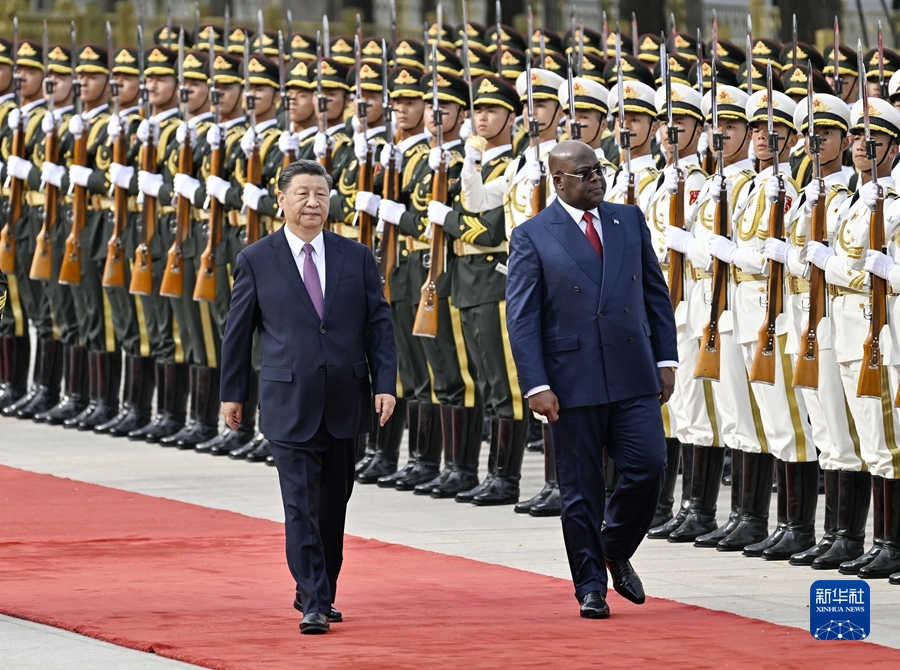 5月26日下午,国家主席习近平在北京人民大会堂同来华进行国事访问的刚果(金)总统齐塞克迪举行会谈。这是会谈前,习近平在人民大会堂东门外广场为齐塞克迪举行欢迎仪式。