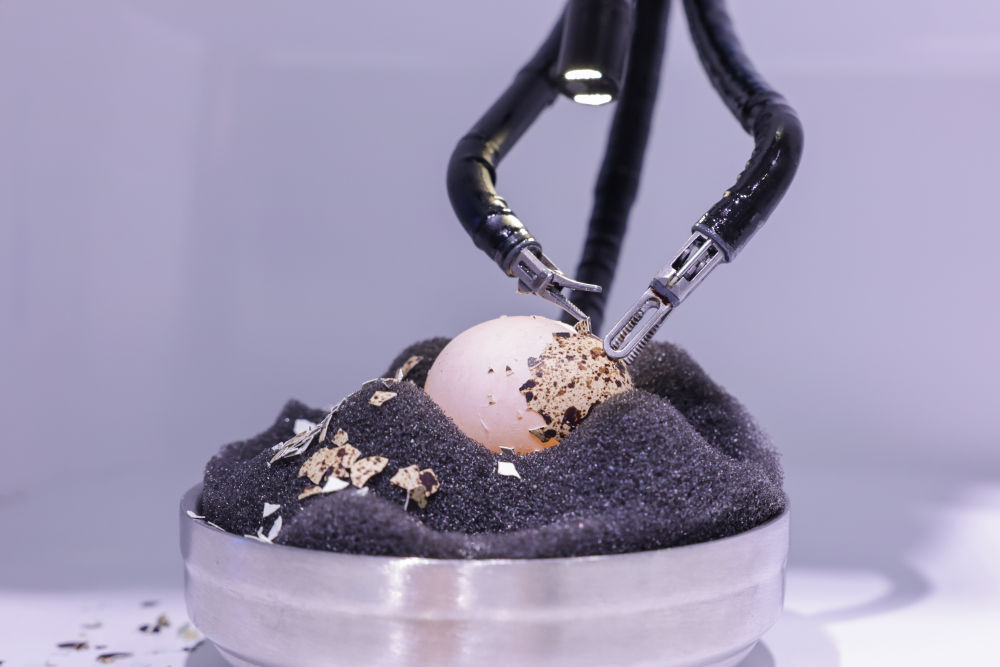 9月2日,在2023年服贸会国家会议中心综合展区,单孔腔镜手术机器人演示剥蛋壳。新华社记者 张玉薇 摄