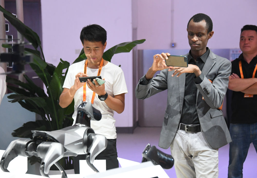 9月2日,观众在2023年服贸会国家会议中心综合展区上拍摄一款仿生四足机器人。新华社记者 任超 摄
