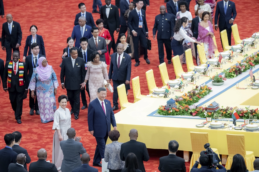9月4日晚,国家主席习近平和夫人彭丽媛在北京人民大会堂举行宴会,欢迎来华出席中非合作论坛北京峰会的非方及国际贵宾。这是习近平和彭丽媛同贵宾们共同步入宴会厅。新华社记者 刘彬 摄