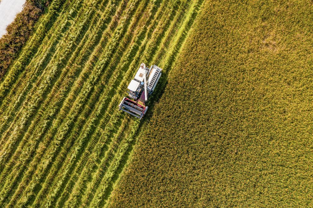 2024年10月25日,收割机在浙江省湖州市吴兴区东林镇保国村的稻田里作业(无人机照片)。新华社记者 徐昱 摄