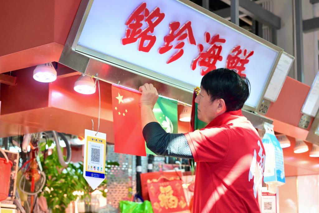 12月18日,澳门红街市的一家鱼档业主关伟铭在档位上挂起崭新的国旗区旗。新华社记者 朱炜 摄