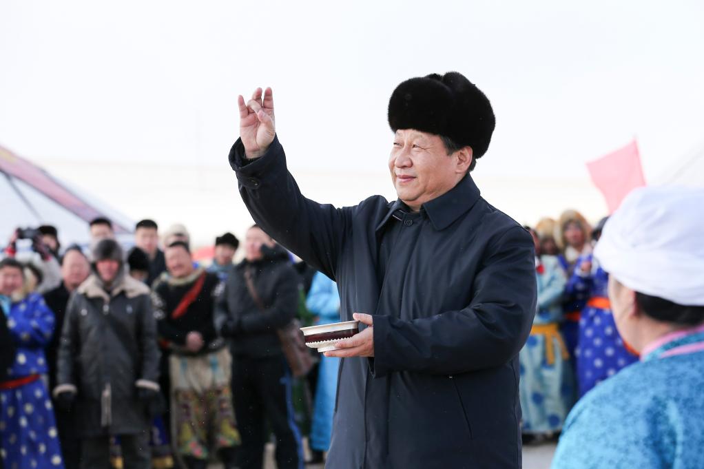 2014年1月,习近平总书记在内蒙古调研看望慰问各族干部群众。按照蒙古族习俗,总书记用无名指蘸上用银碗盛着的鲜牛奶弹了三下,借“五畜祈福”寓意,祝福来年风调雨顺,五畜兴旺,人民幸福安康。