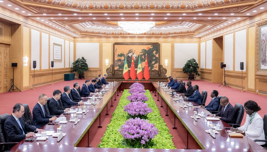 6月27日上午,国家主席习近平在北京人民大会堂会见来华出席夏季达沃斯论坛的塞内加尔总理松科。新华社记者 翟健岚 摄