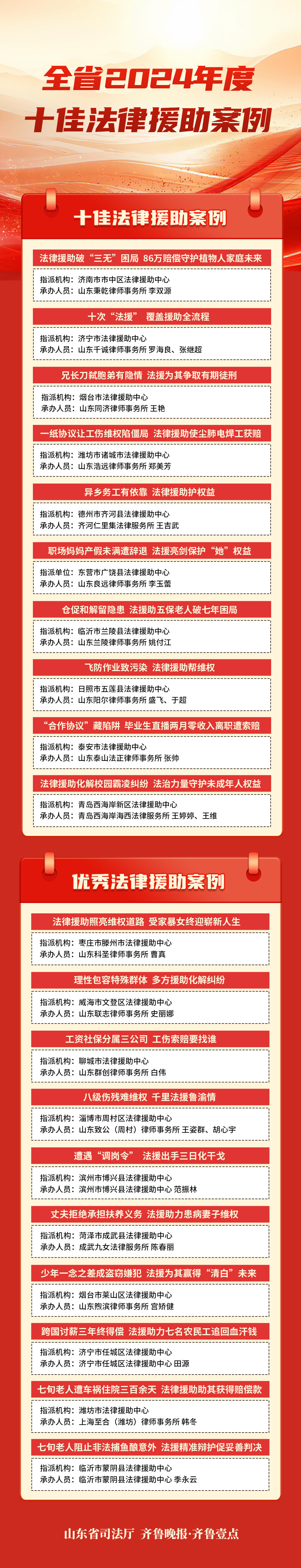 2025年7月1日,为深入贯彻落实法律援助法,持续扩大法律援助社会知晓率,鼓励和引导法律援助案件承办人员提供优质高效的法律援助服务,由山东省司法厅联合齐鲁晚报·齐鲁壹点开展的2024年度全省“十佳法律援助案例”评选活动正式启动,各地共报送法律援助案例65篇,经筛选择优在网络发布39篇,全网阅读量达3201.5万,取得了良好的社会效果。