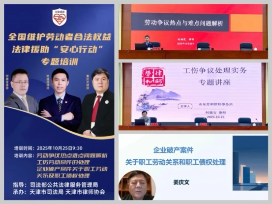 为深入推进维护劳动者合法权益法律援助“安心行动”,加强劳动领域法律援助专业力量,提升劳动者法律援助服务能力,2025年10月25日,由司法部公共法律服务管理局指导,天津市司法局、天津市律师协会承办的全国维护劳动者合法权益法律援助“安心行动”专题培训班在津举办。全市各级司法行政部门管理人员、法律援助机构工作人员、法律援助律师及部分高校法律援助志愿者共计150人现场参训,全国各省市约1.5万人观看视频授课。
