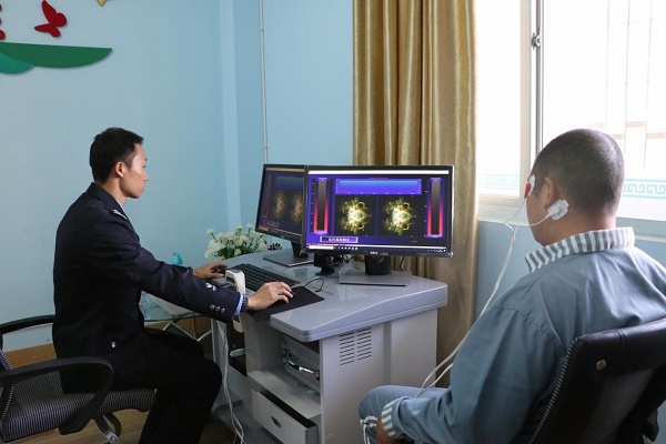 福建省司法行政戒毒场所运用生物反馈仪对戒毒人员进行治疗。