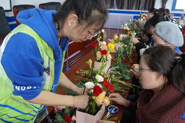 贺兰县社区矫正中心开设的手工编织课上,社区矫正对象正在学习插花技术。受访者供图